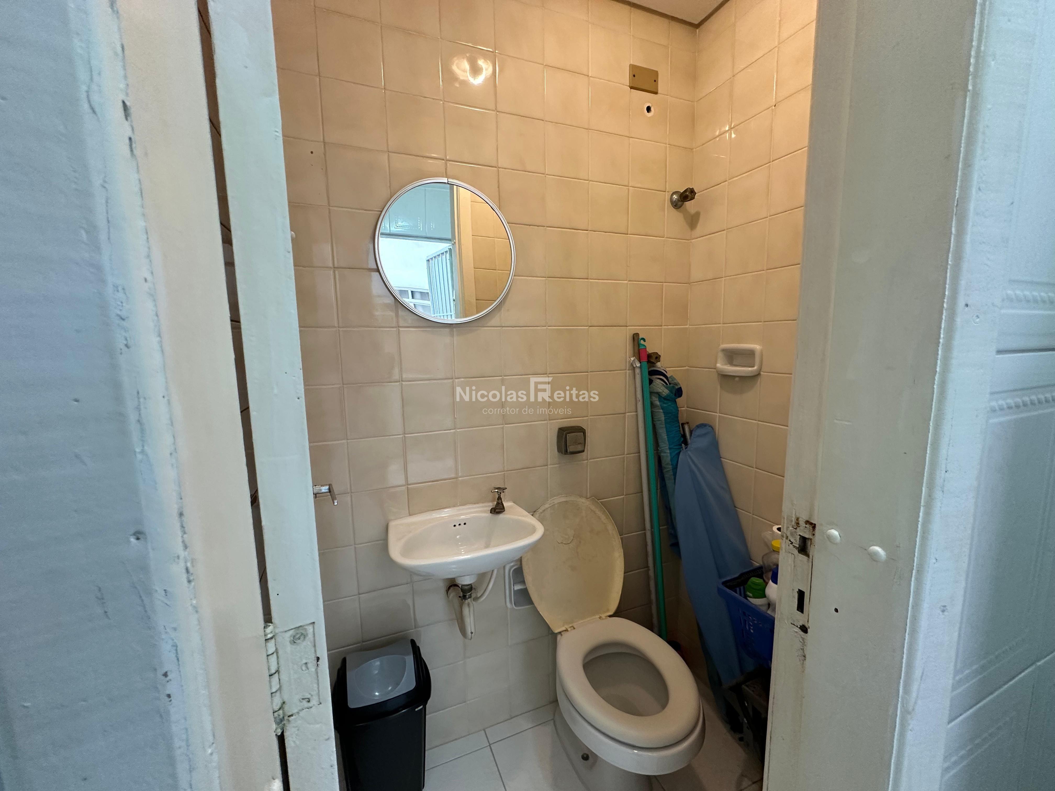- Banheiro social: Com box em vidro e ventilação natural.