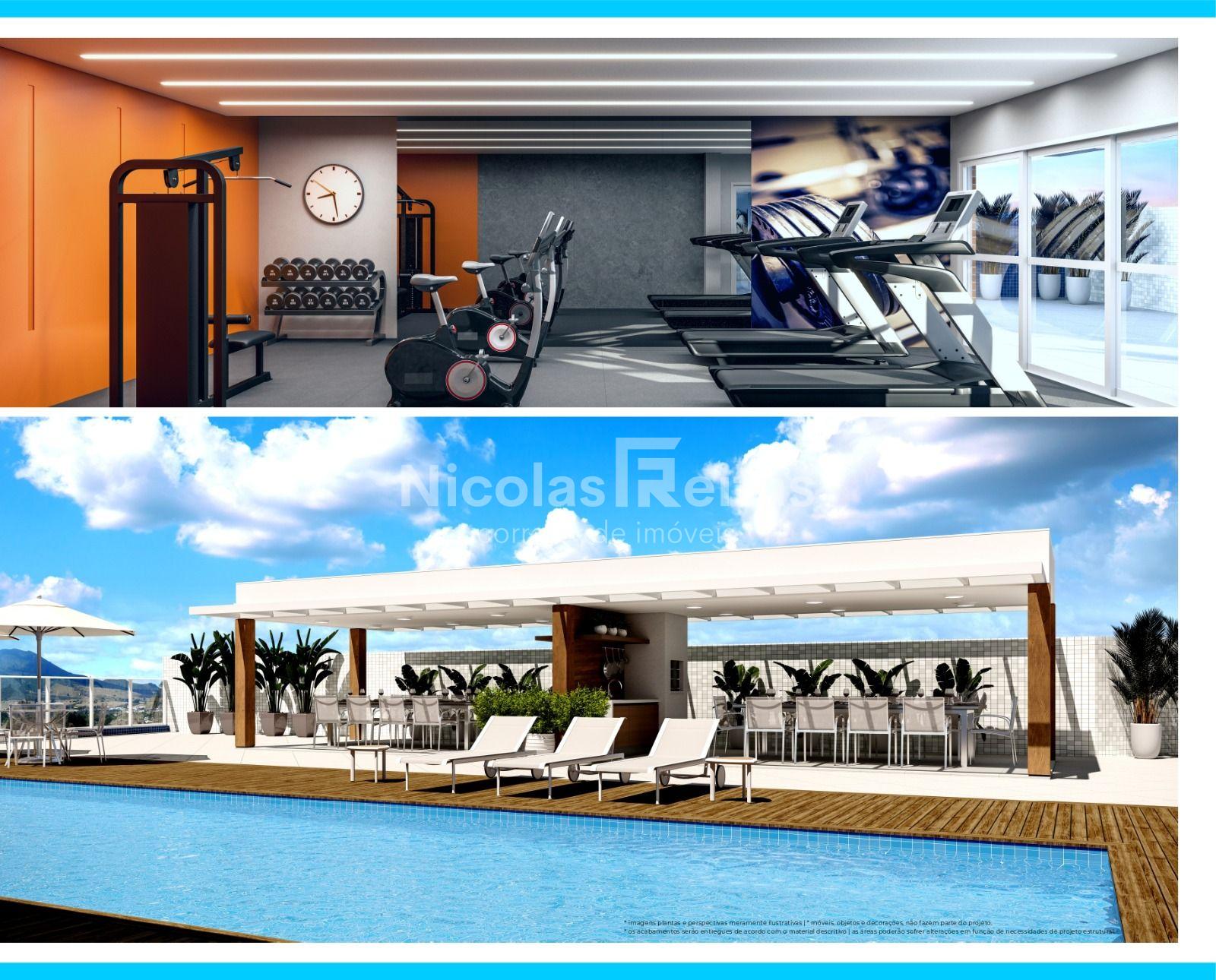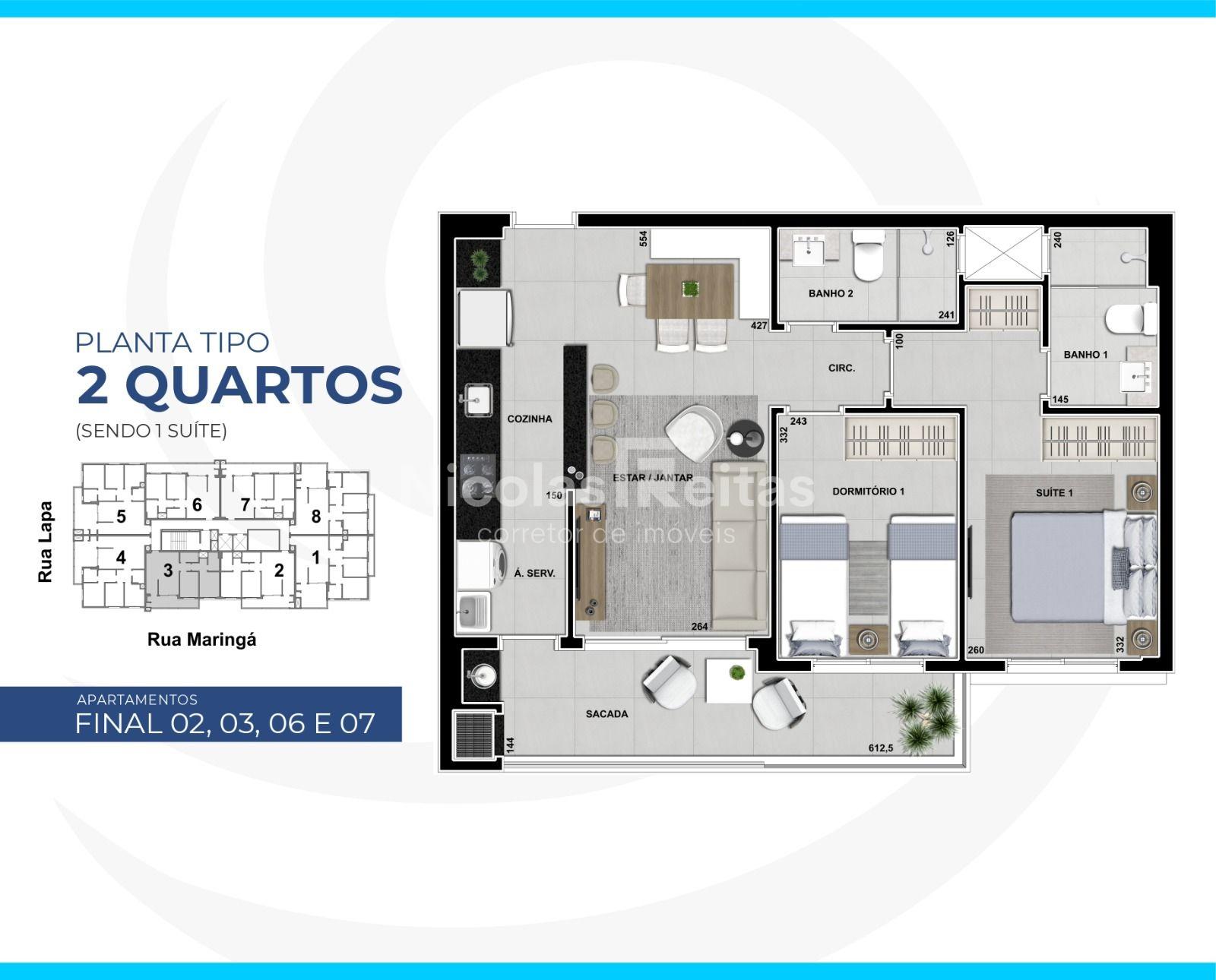 Apartamentos de 02 dormitórios sendo (1 suíte), sala de estar e jantar, conceito aberto, cozinha americana com passa pratos, área de serviço, 01 banheiro social, 01 vaga de garagem com hoby box